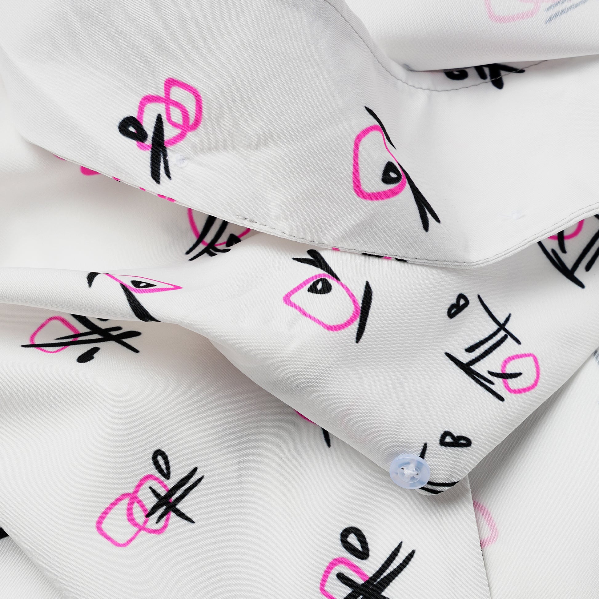 Worn by Jim Carrey in his wild breakout role as Ace Ventura, this white button-up with neon pink and abstract black doodles became instantly iconic. It’s part 80s art school, part chaos, and 100% certified pet detective fashion.