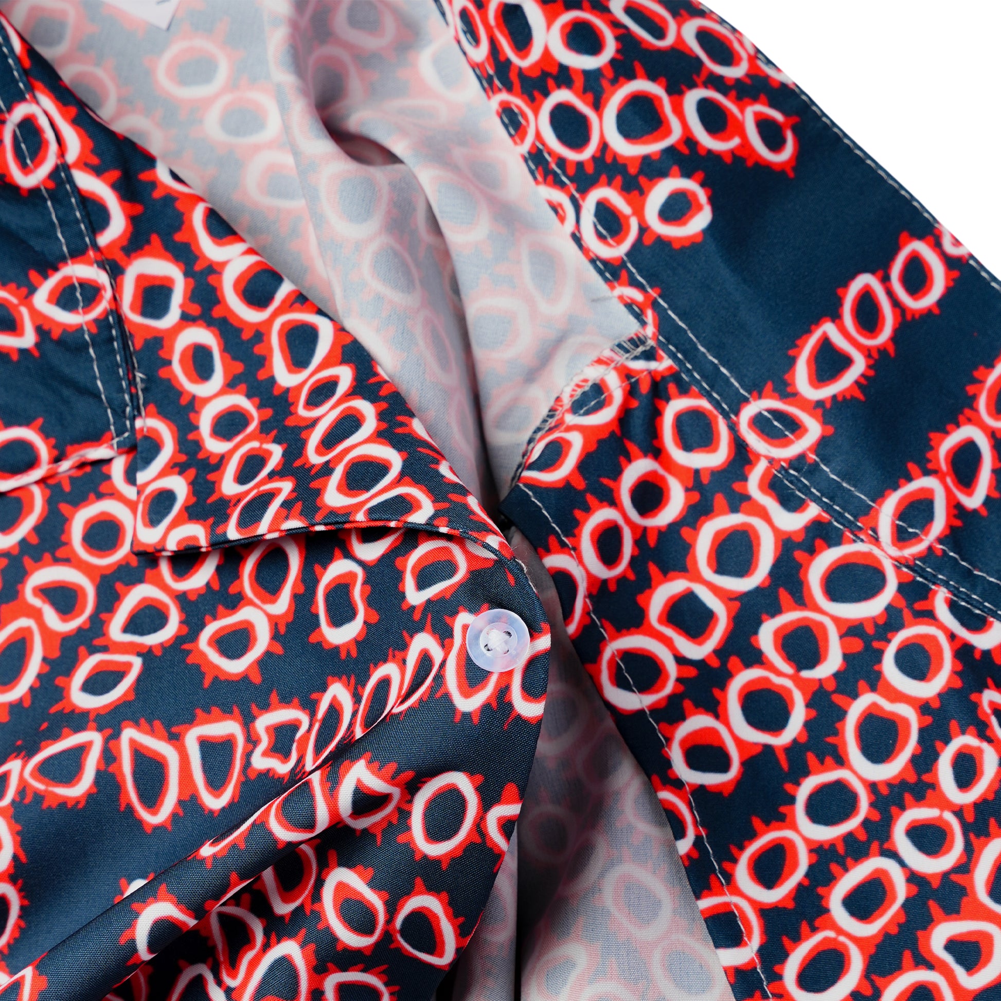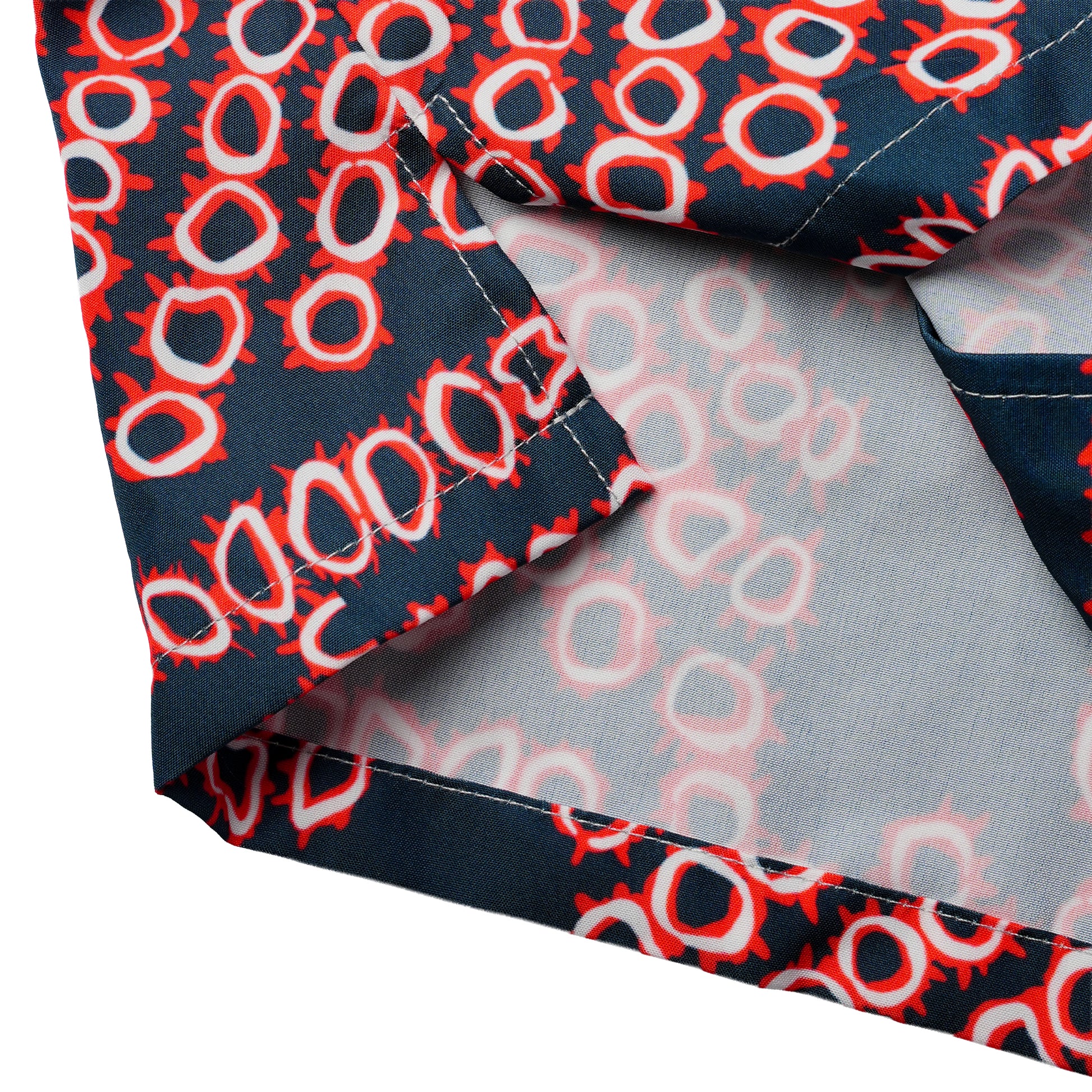 This is the hypnotic, high-contrast shirt worn by Biff Tannen in Back to the Future Part II, featuring bold geometric spirals and repeating circular motifs in electric red over deep navy. It’s a visual punch that screams alternate-timeline villain with a taste for flash.